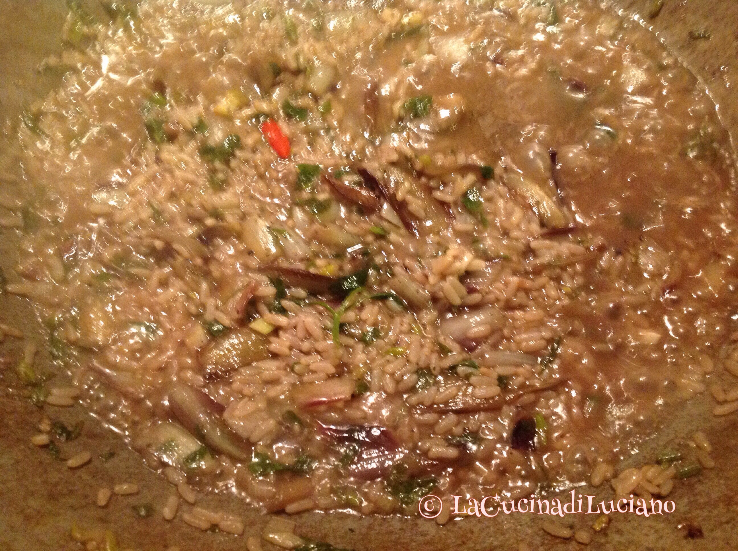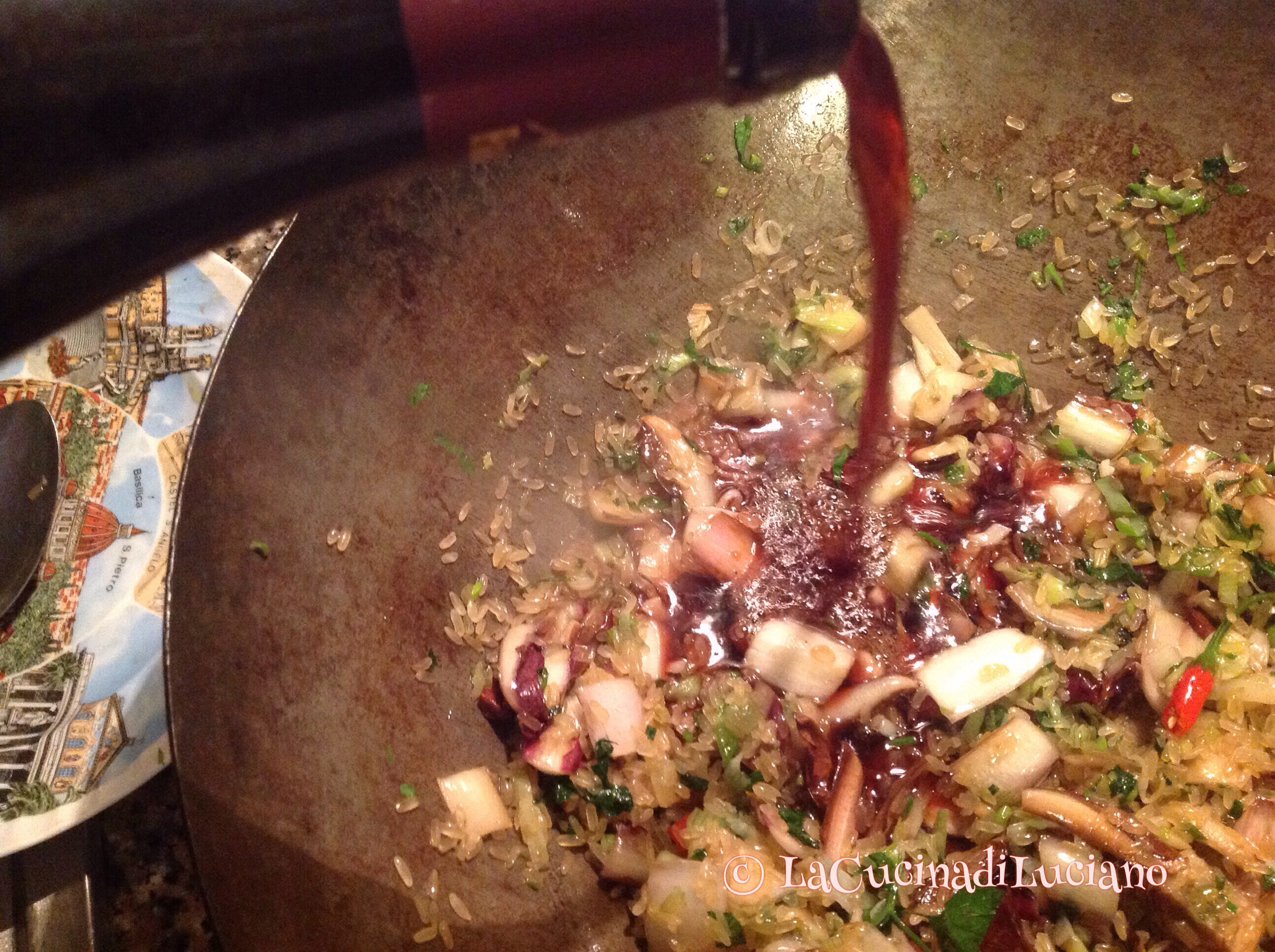 Coprire il tegame e lascia asciugare il vino (sempre a fiamma alta).