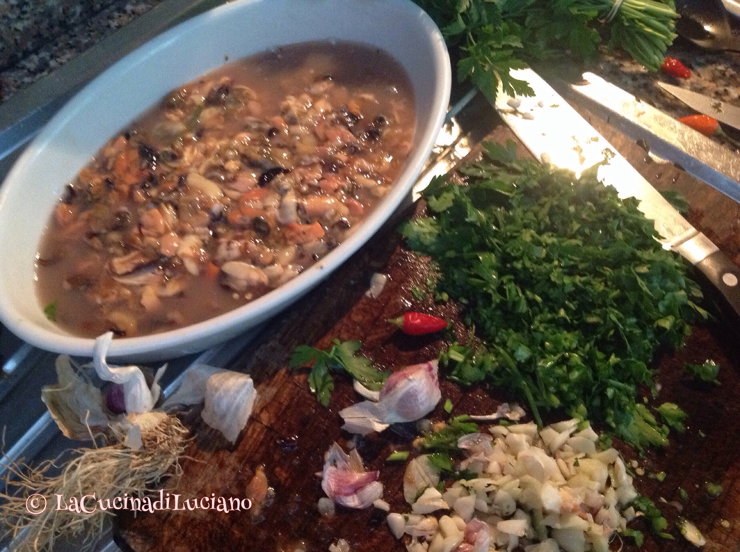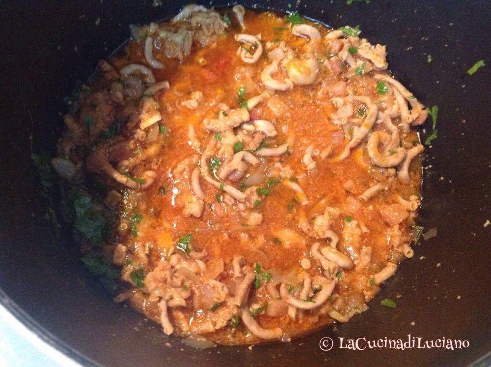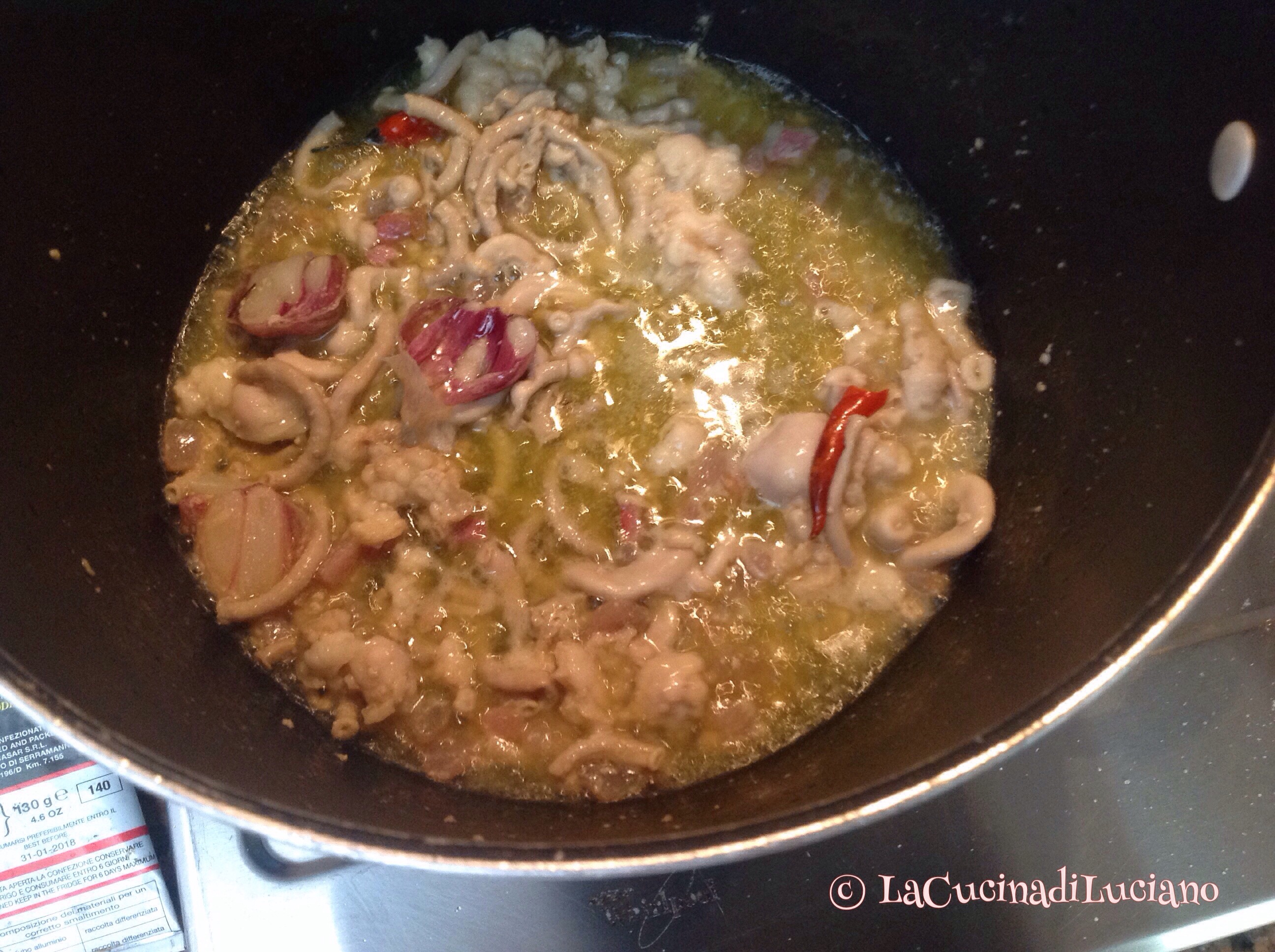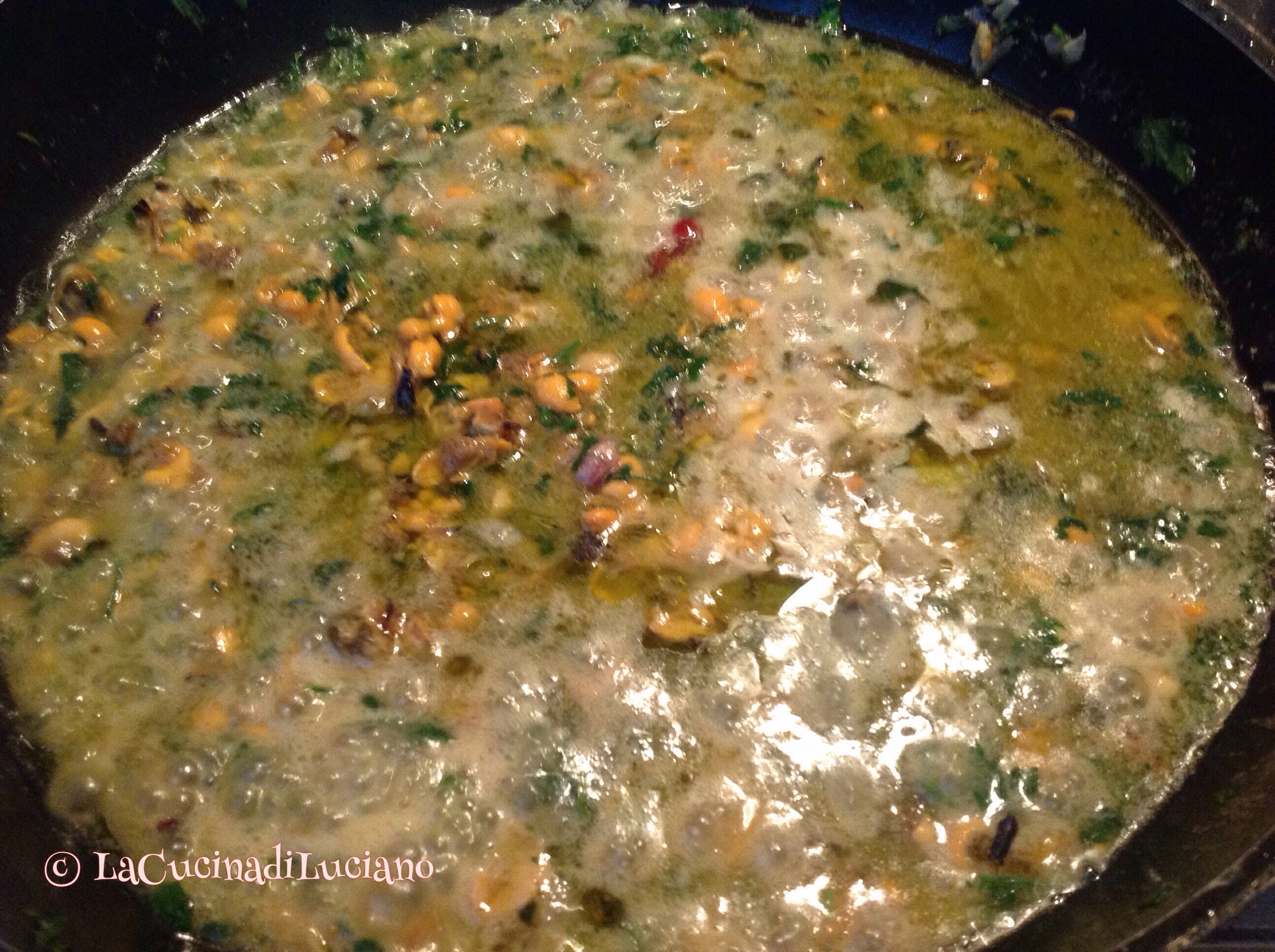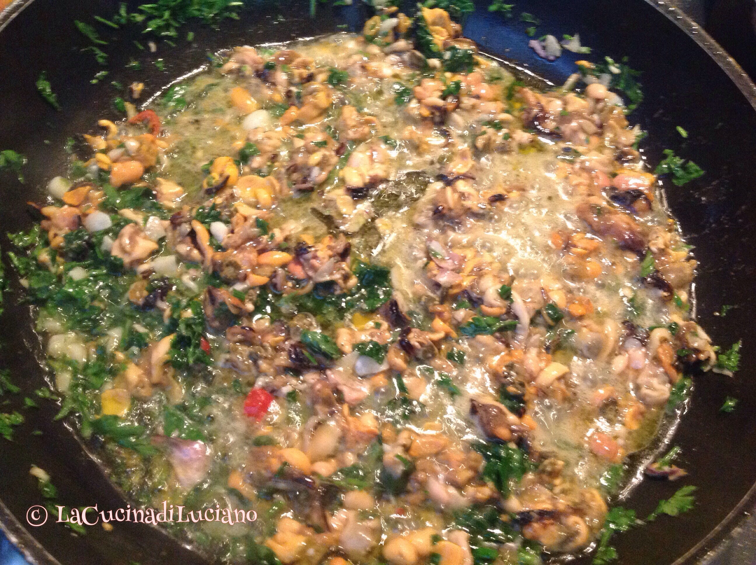 I molluschi tritati li devi aggiungere a piccole dosi a fuoco vivace in modo da farli soffriggere velocemente altrimenti viene fuori tutta l’acqua dei molluschi. Il sugo deve rimanere abbastanza oleoso, se la pasta piace un po’ sugosa si aggiunge un po’ di acqua delle cozze.