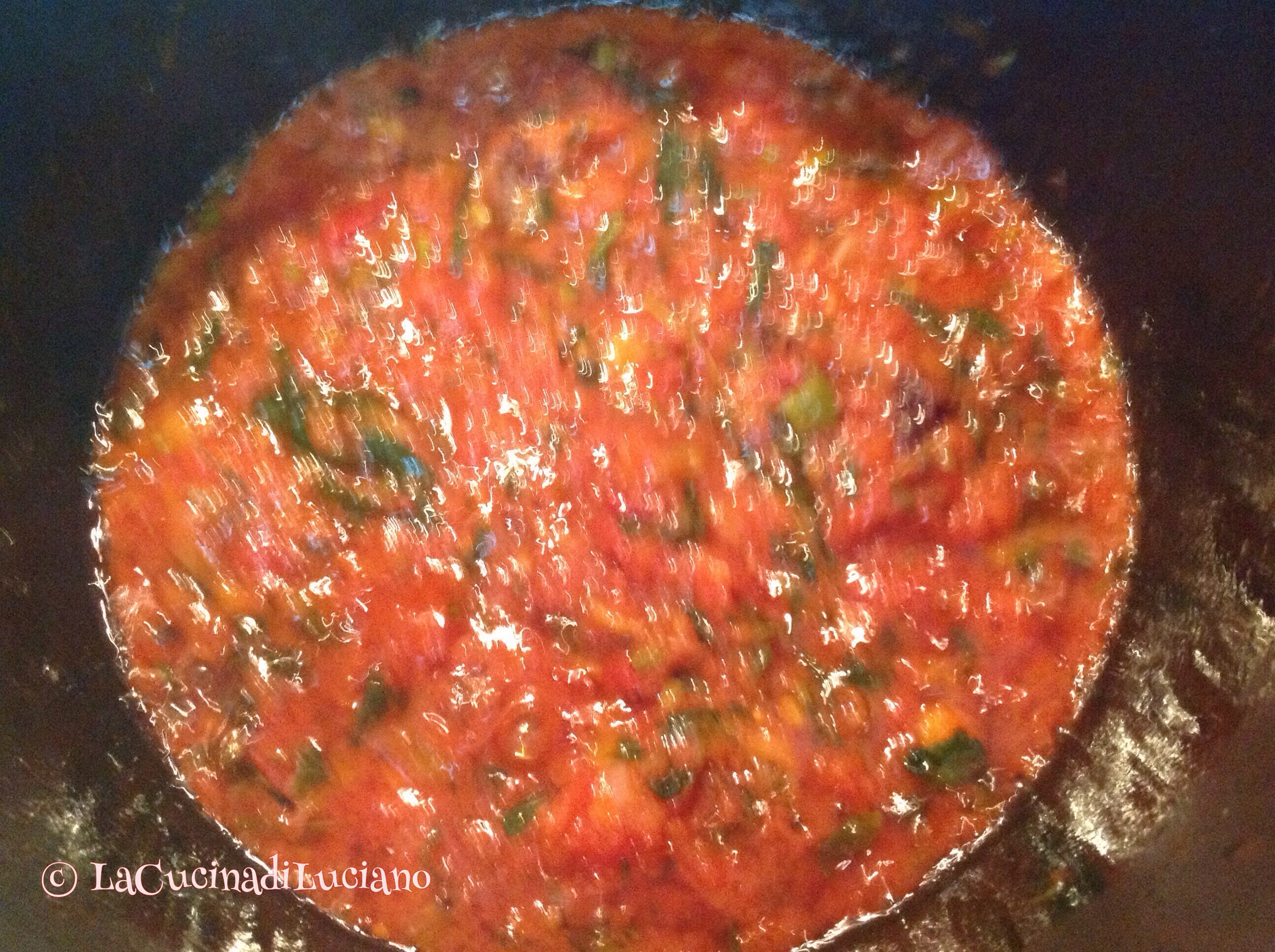 Quando tutti pezzi di pomodori sono nel tegame aggiungi i pomodori pelati, il basilico e fai cuocere a fuoco alto ancora per altri 10 minuti