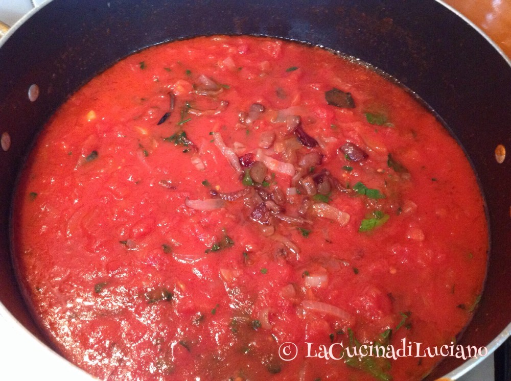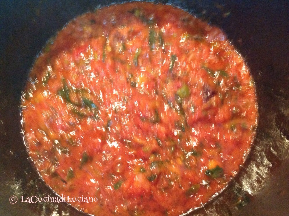 Metti il lardo tagliato a dadini con l’olio a sciogliere in un tegame. Aggiungi il trito della cipolla e fai rosolare. Unisci il peperoncino, il pomodoro secco tagliuzzato, i pomodori pelati, fai saltare sempre a fuoco alto, aggiungi il prezzemolo, il basilico e fai cuocere, ancora per circa 15/20 minuti.