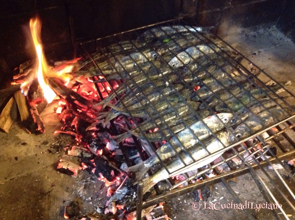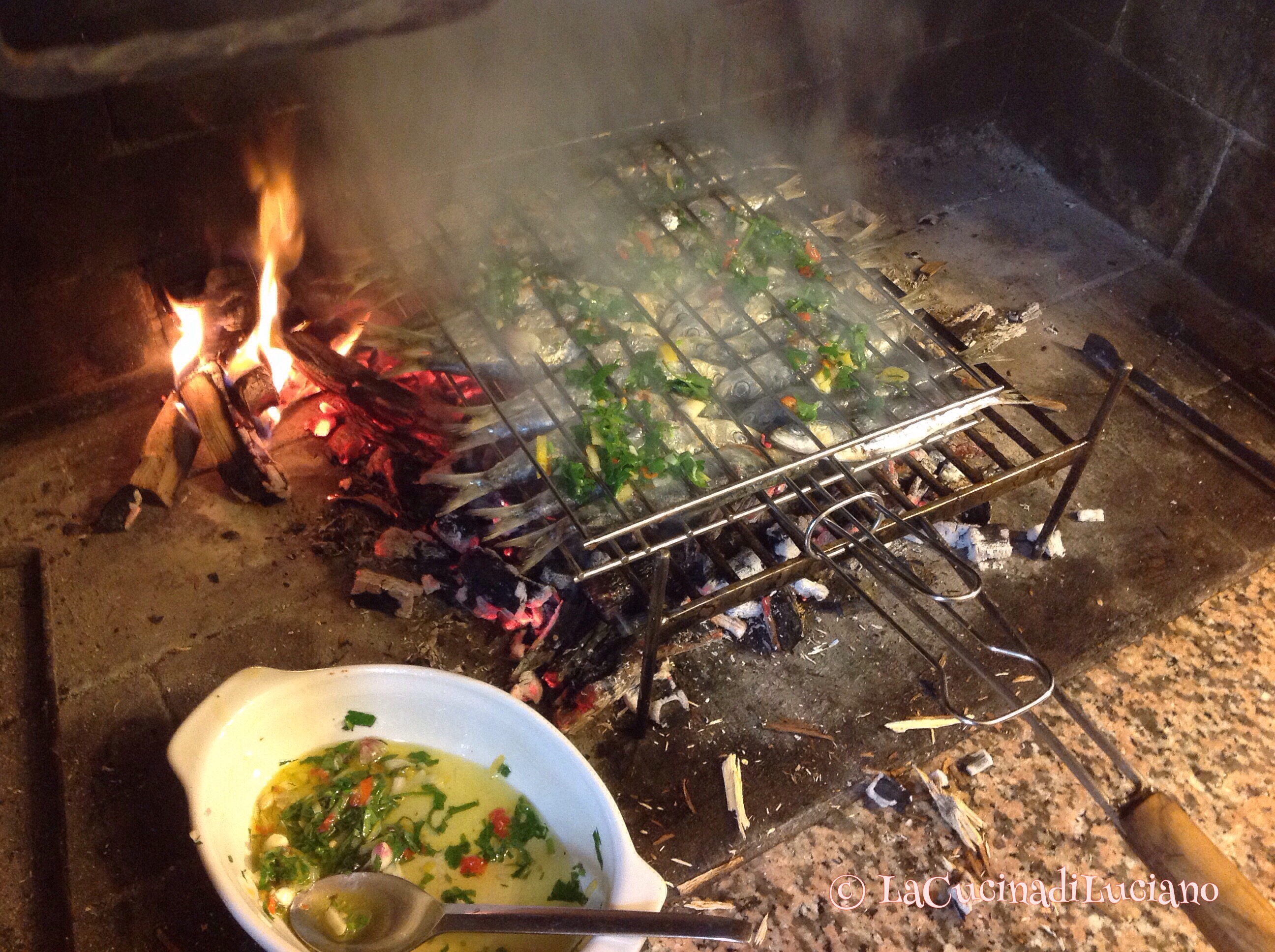 Metti la graticola sulla brace brace per 2/3 minuti, gira la graticola e condisci le sardine con il pinzimonio
