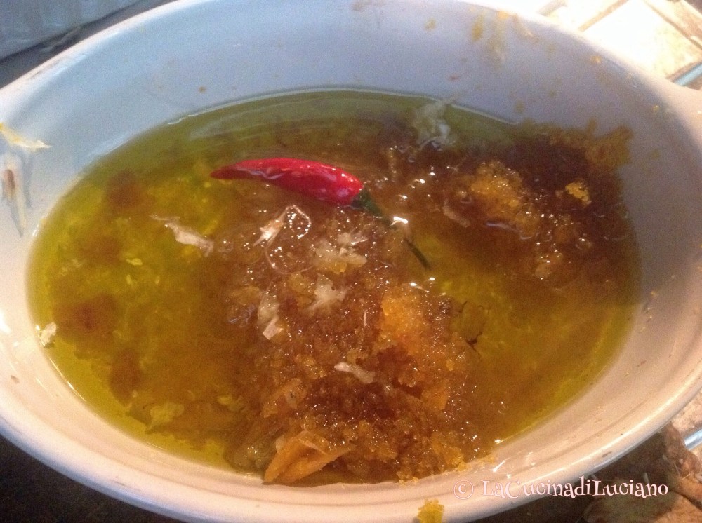 Metti in una padella, l’olio, scalda con uno spicchio d’aglio schiacciato, quando questo è dorato toglilo e aggiungi l’aglio e il prezzemolo tritato e il peperoncino
