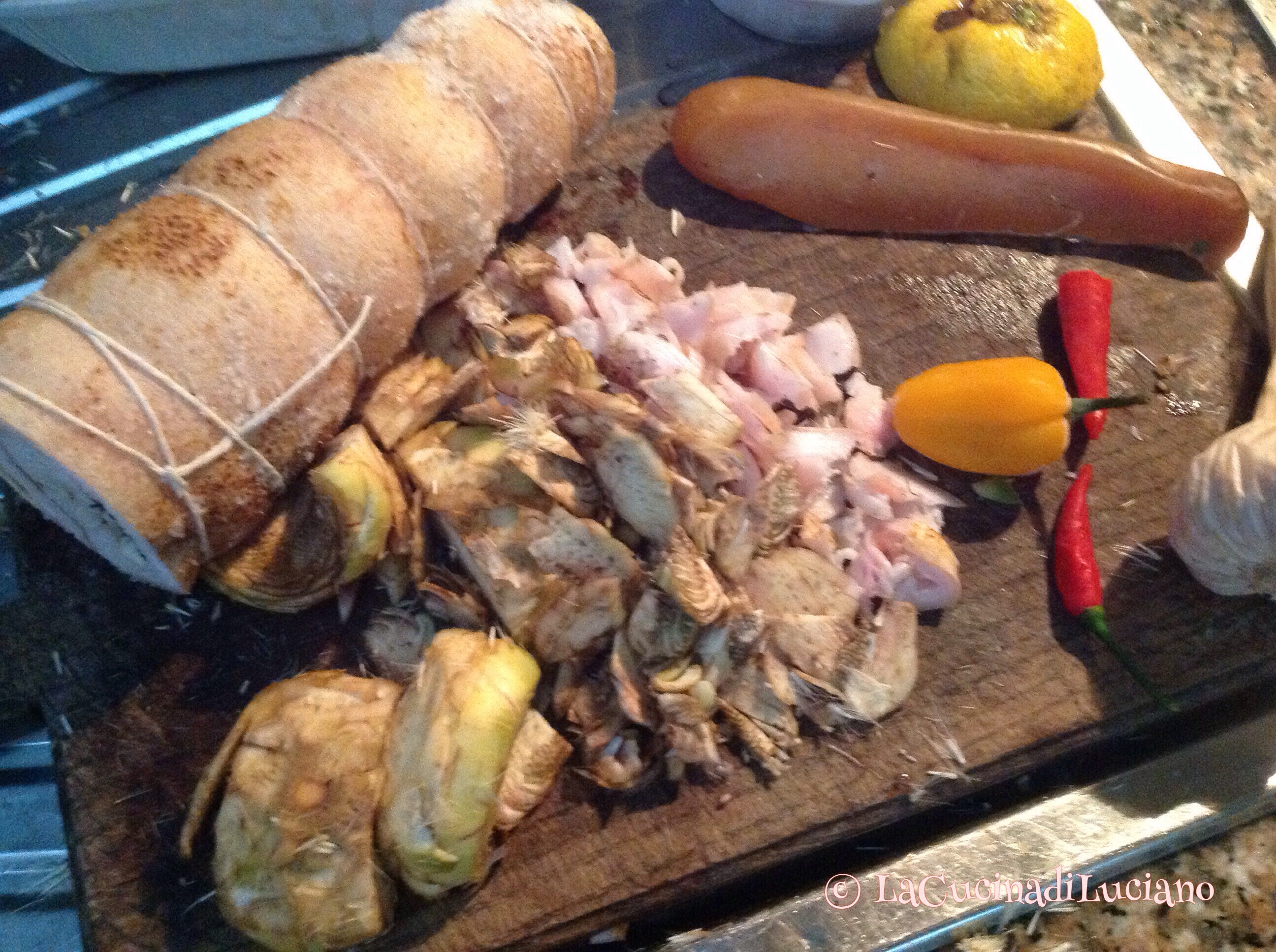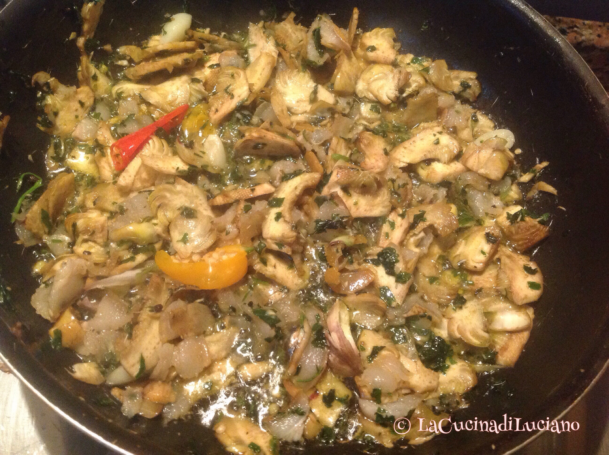 In una padella, fai soffriggere l’aglio in camicia (che poi deve essere eliminato),  i peperoncini per alcuni minuti, aggiungi il lardo tagliuzzato, il prezzemolo i carciofi e fai saltare per altri 2 minuti