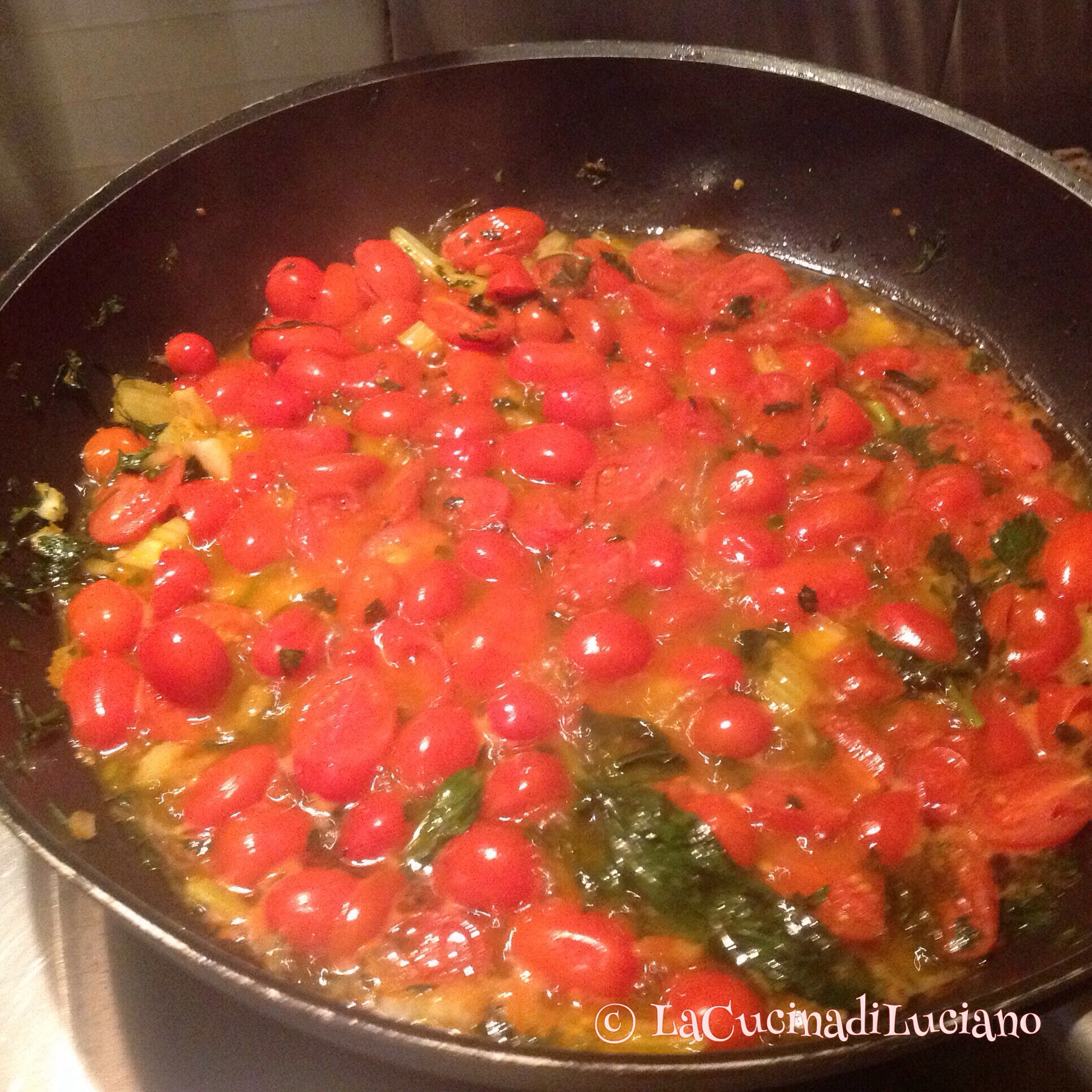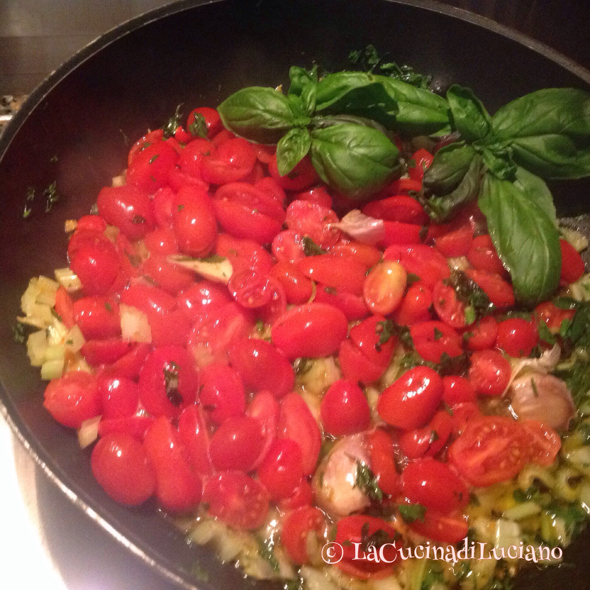 Far appassire i pomodorini, aggiungi il basilico, un po di acqua calda e fai cuocere, ancora per ca 10 minuti.