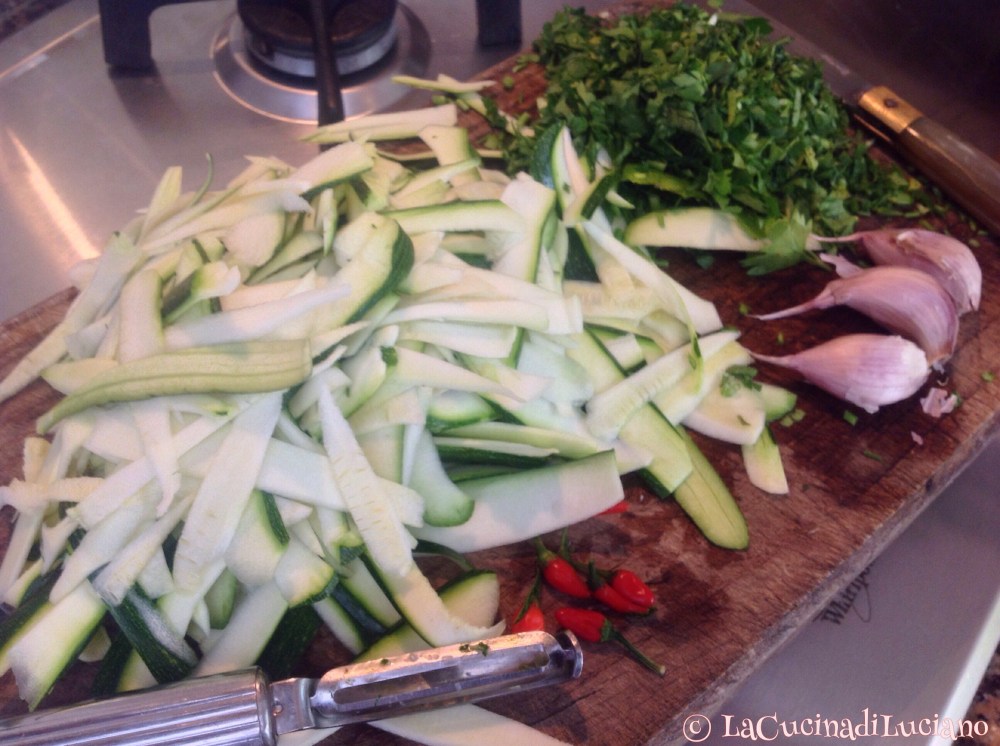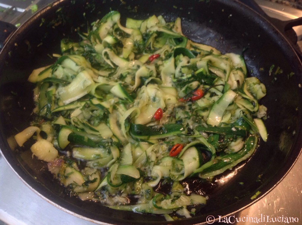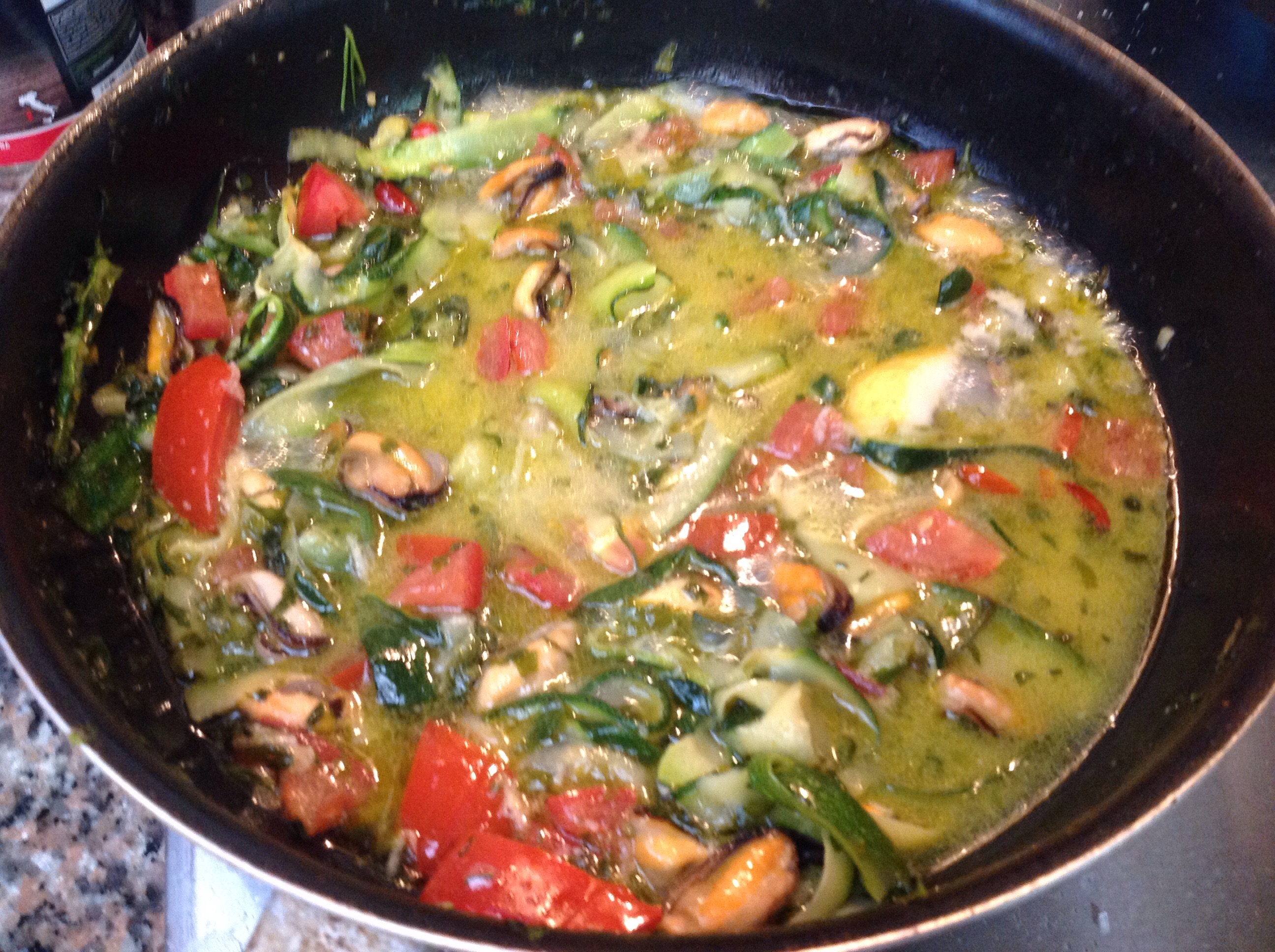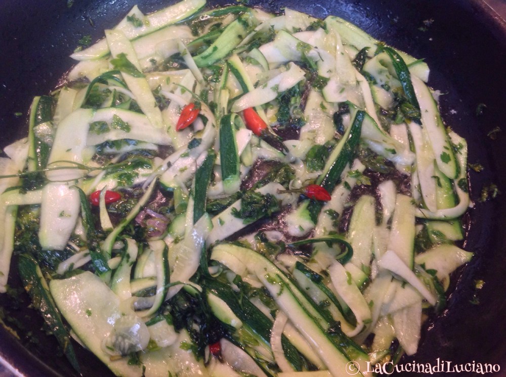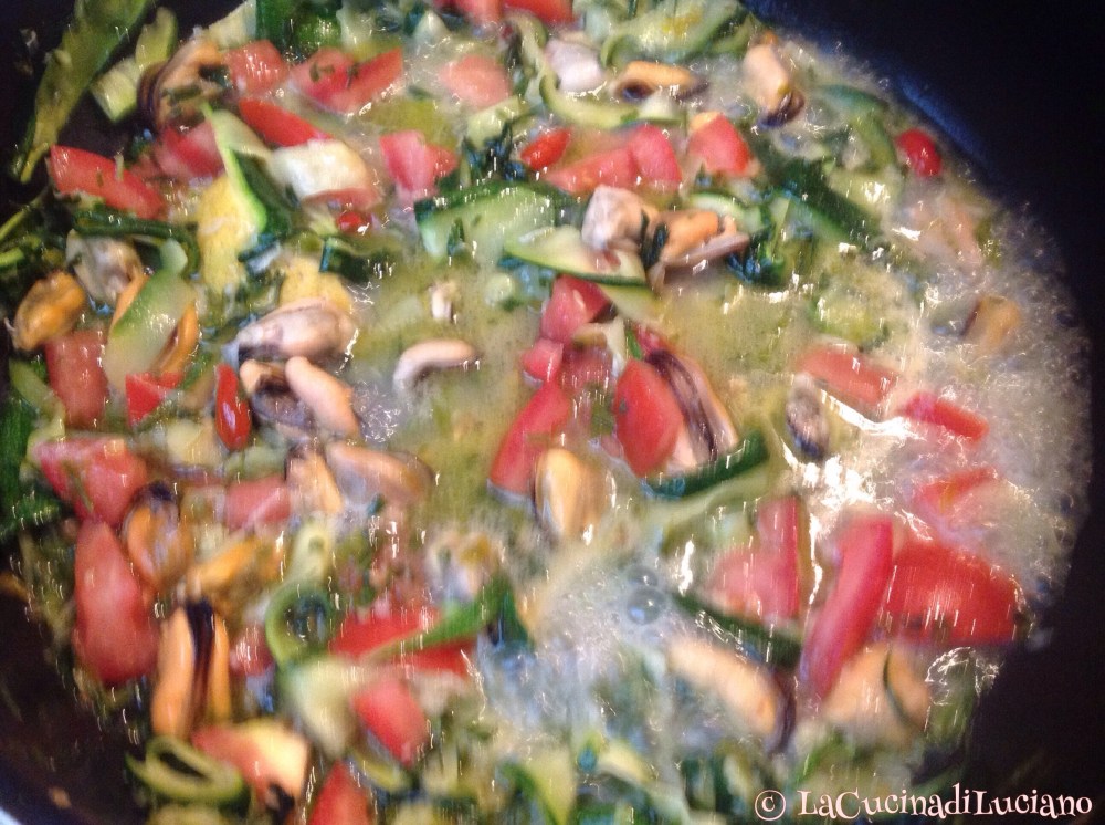 Usa meta’ delle cozze per mangiarle come antipasto e l’altra meta’ sgusciate mettile nelle zucchine con un po’ di sugo di cottura delle cozze. Aggiungi un pomodoro fresco tagliato a pezzetti e fai insaporire il tutto per 3/4 minuti.