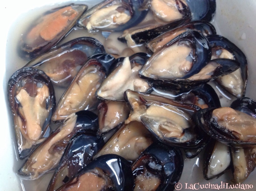 Lava bene le cozze togli lo spago e aprile crude se possibile (In alternativa aprile in padella senza fare cuocere)