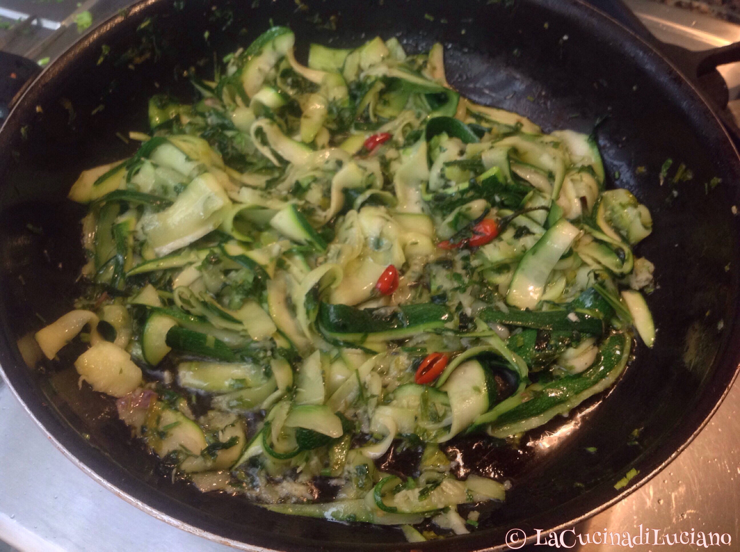 Ora metti nel tegame le zucchine a piccole dosi e far saltare a fuoco alto, fino a quando non le hai messe tutte. Sala quanto basta aggiungi l’aglio grattugiato e fai appassire ancora per alcuni minuti.