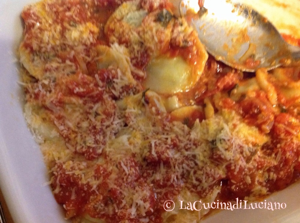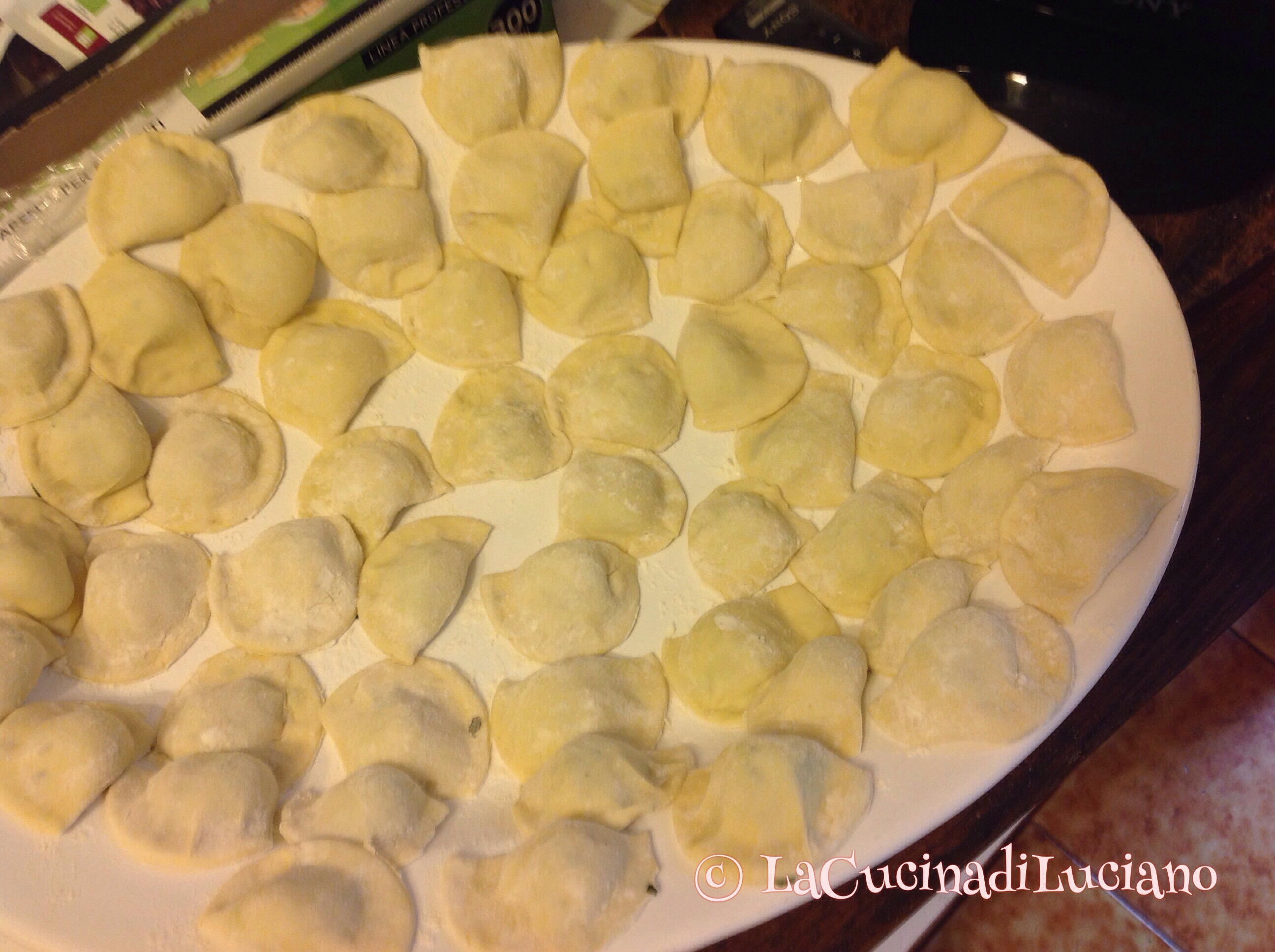 Predi la pasta e prepara le sfoglie con un matterello (o con la macchinetta tipo imperia per fare la sfoglia) larghe circa 10/12 cm e lunghe 40 /60 cm dove metterai il ripieno distanziato di circa 3/4 cm, circa un cucchiaio. Piega la sfoglia sopra il ripieno premi per far uscire l’aria e richiudi i bordi con apposita rondella dentata o usando il bordo di un bicchiere.