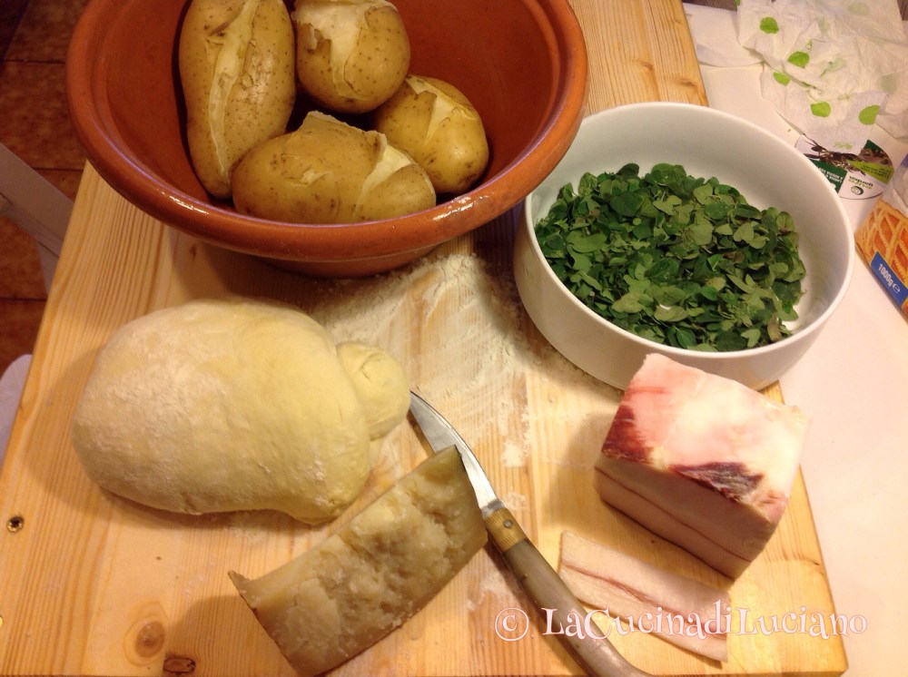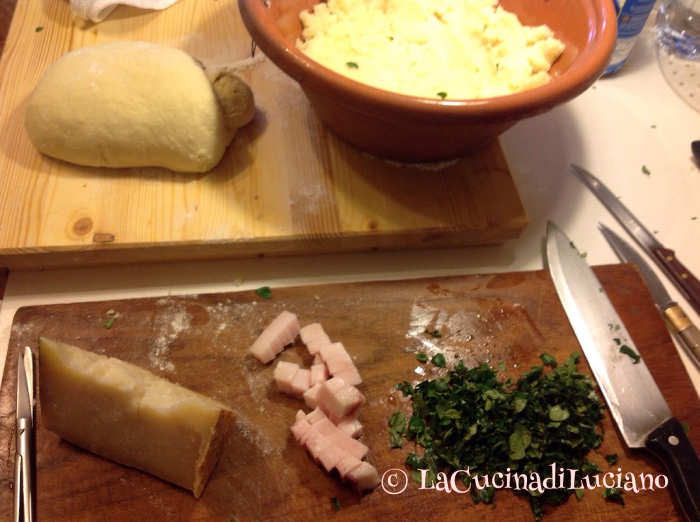 Fai sciogliere in un padellino con l’olio il lardo tagliato a dadini, metti al centro della terrina sopra le patate l’origano sminuzzato e versa sopra il lardo sciolto nell’olio ancora caldo. Aggiungi il sale il pecorino, la farina, amalgama bene il ripieno e lascia riposare.